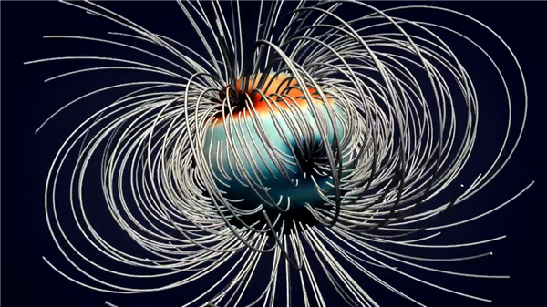 当你观察地球时,我们有一个相当简单的磁场,它就像一个巨大的条形磁铁,有南北磁极。