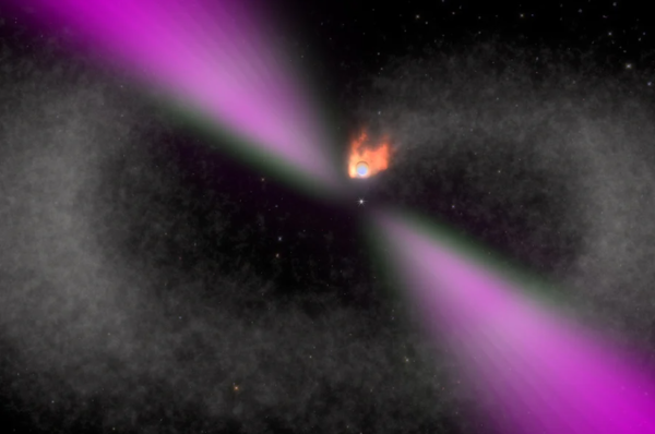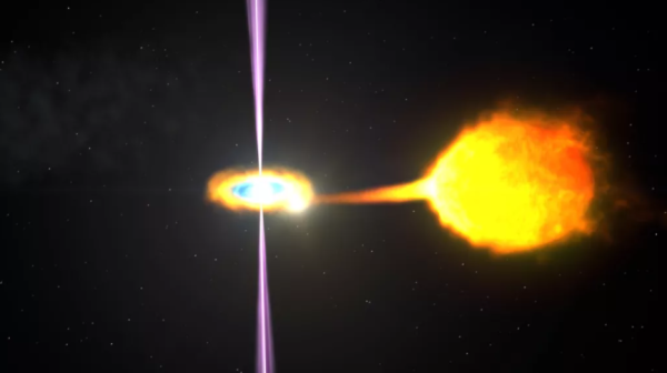 * 艺术家描绘的黑寡妇脉冲星从伴星上撕裂物质的景象