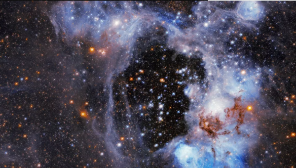 哈勃太空望远镜拍摄的这张图像为我们展示了稀薄的气体云和一个奇怪的“超级气泡”。该星云,或者说气体云,被称为“N44”,位于附近的大麦哲伦星云中。在图片中,你可以看到氢气在黑暗中发光,伴随着黑暗的尘埃带和各个年龄的恒星。这个复杂结构距离地球大约17万光年。