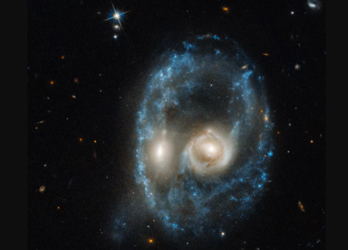 在这张由哈勃太空望远镜拍摄、地球物理学家伯努瓦·布兰科于2019年处理的图像中,数十亿颗蓝色恒星组成的明亮环围绕着一个小得多、密度大得多的红色恒星球体形成了一个完美的圆形。在两个恒星圈之间的黑暗间隙中,另一个离我们远得多的环星系,正探出头来向我们问好。