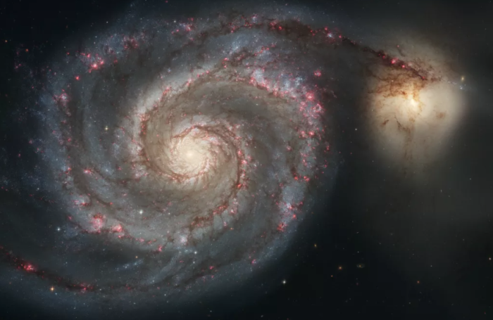 在这张照片中,漩涡星系(NGC 5194)看起来像是用一条长长的旋臂环绕着它的较小的星系伴星NGC 5195。右边那个黄色的小星系就是NGC 5195,它是一个矮星系。虽然NGC 5195看起来像是在拽着它的大伴星的尾巴,但它其实只是从大伴星的背后穿过。这是哈勃望远镜15周年纪念的照片,于2005年4月25日发布。
