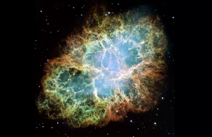 这幅蟹状星云(NGC 1952)的彩色图片是哈勃太空望远镜拍摄到的最大图像之一。蟹状星云是超新星的遗迹,跨度约6光年。它位于金牛座,距离地球约6500光年。它足够明亮,可以用双筒望远镜从地球上看到。