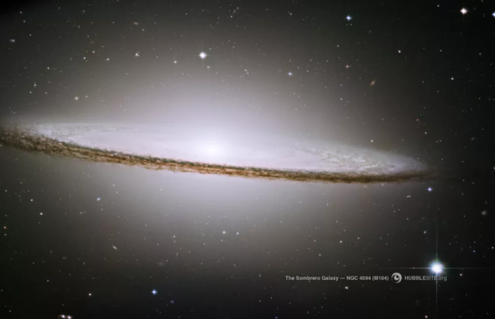 NGC 4594,也被称为“草帽星系”,这是该星系的侧视图——一个明亮的白色核心被厚厚的尘埃带包围。这张照片于2017年发布,是哈勃观测到的最大的合成图像之一。