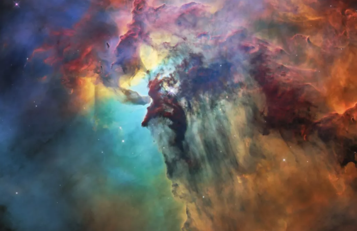 为了庆祝哈勃望远镜进入太空28周年,它拍摄了这张礁湖星云的照片。该星云距离地球约4000光年,宽55光年,高20光年。这张照片只展示了这个混乱的恒星形成区域的一小部分,大约4光年宽。这张图片是2018年2月12日至2月18日期间由哈勃的3号广角相机拍摄的。
