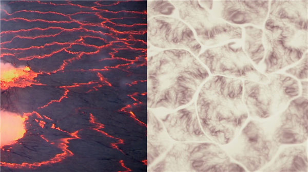 与这类似,但要快得多的过程就是地球上最活跃的熔岩湖中形成的拼接图案。炽热的熔岩团上升,在表面形成圆形的格子,而冷却的熔岩下沉,在熔岩热泡形成的缝隙之间滑动。