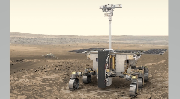 * 艺术家对罗莎琳·富兰克林号漫游者的描绘,它正在用“失落之锤泉”的微生物样本来测试它的生命探测能力
