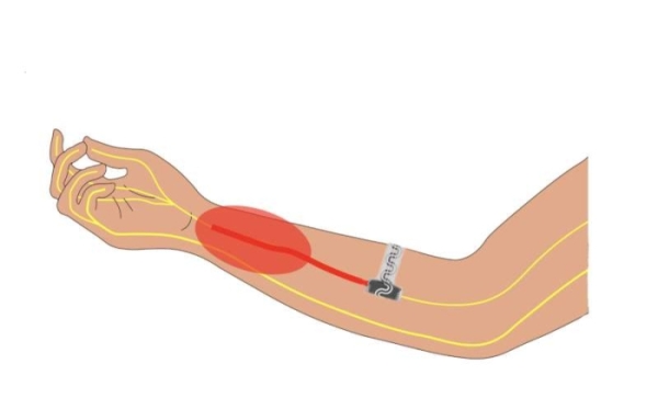* 手臂内可植入设备的图示。红色椭圆表示疼痛。该装置轻柔地包裹在周围神经周围,以使向大脑发出的信号静音。