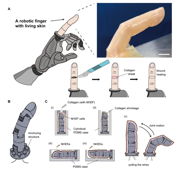 包裹在机器人骨骼周围的自我修复皮肤能让人联想到各种科幻图像,最近日本研究人员已经成功开发出一种覆盖着“活”皮肤的可控机器人手指,他们说这可以使机器人像真正的人类一样接近现实。