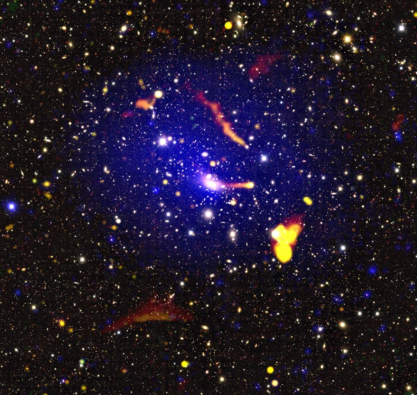 星系团为我们提供了实验室无法重现的研究环境和研究条件,当星系团相互碰撞时,大量的能量被注入热等离子体的粒子中,会发出无线电辐射,辐射的形状和大小各不相同。