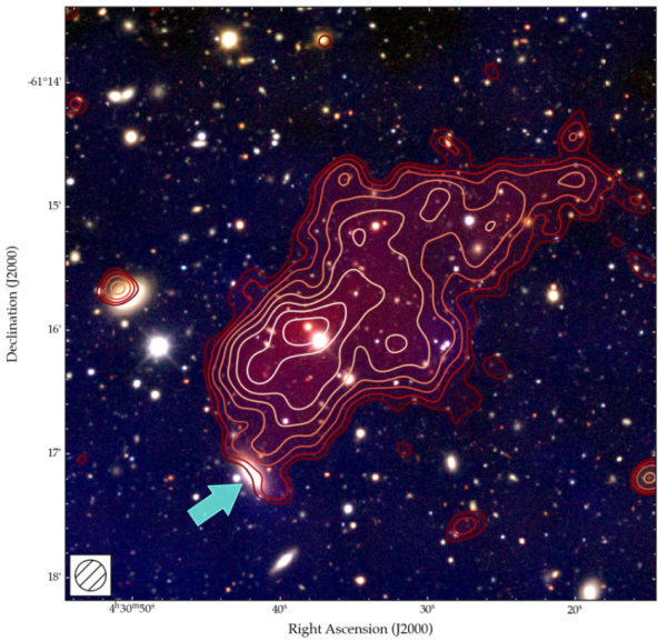 这里显示的是Abell 3266的射电遗迹,红色和等高线描绘了ASKAP测量的射电亮度,蓝色表示热等离子体。青色箭头指向我们认为曾经为化石提供动力的星系。在右上方和下方可以看到,射电能量非常微弱,呈红色,表明它的形成年代非常古老。我们认为,这个射电辐射最初来自左下方的星系,它的中心有一个黑洞,但长期以来一直处于关闭状态。