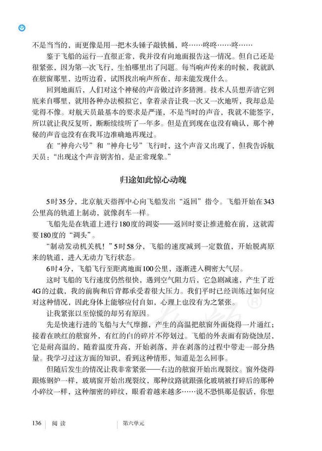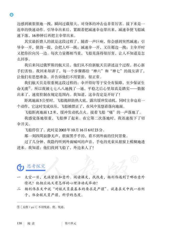 近日有网友发现,人教版七年级下册语文书中有篇课文名为《太空一日》,作者正是杨利伟。6月26日,《太空一日》文章被发到网上后,仅数小时转发上万!在该课文中,杨利伟详细生动地描述了自己飞行间的各个细节过程,动魄惊心又充满胜利的喜悦。