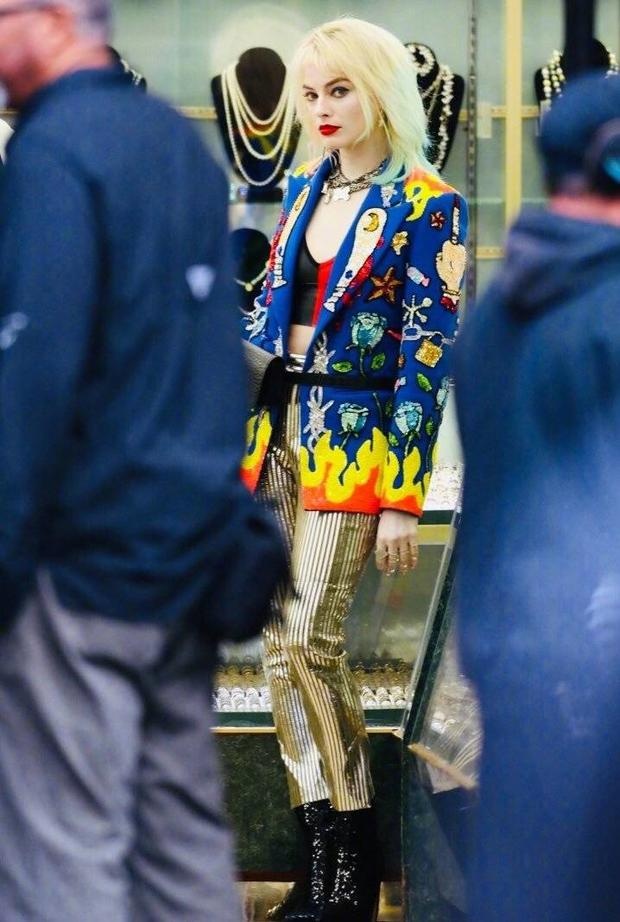 1905电影网讯 近日,DC超级英雄电影《猛禽小队》曝光主演玛格特·罗比的最新片场照,“小丑女”的新造型随即亮相。她身穿蓝色夹克,夹克上的花纹繁杂艳丽,内搭一件黑色与红色相间的露脐上衣以及一条高腰金色条纹长裤,外型十分抢眼。