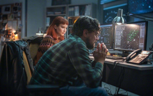 如此解读这部电影是有道理的,我们也有充分的理由支持这种论调。毕竟,这部电影演绎了一个沉迷于社交媒体的文明是如何忽视科学家的。科学家们向世界发出警告:地球上的生命面临威胁。但他们想拯救地球的愿望却被政客和商界人士暗地里破坏了,因为这些人把眼前的利益置于未来的危险之上。这种解读跟迪卡普里奥关系不大,他在片中饰演一位笨手笨脚的天文学家,也是世界上最重要的、最著名的气候活动家之一。