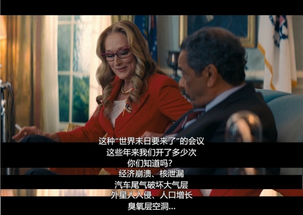 从一开始,科学家们的努力就是徒劳的,这体现在影片开头的一幕:凯特·迪比阿斯基(由劳伦斯饰演)和兰德尔·明迪(由迪卡普里奥饰演)被带到了白宫,向珍妮·奥尔琳(由梅丽尔·斯特里普Meryl Streep饰演)总统汇报即将发生的大灭绝事件。
