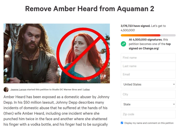 约翰尼·德普和前妻艾梅柏·希尔德之间的官司让普通吃瓜群众了解到了背后的一些事情。日前有一个针对艾梅柏·希尔德的请愿网站,请求DC将艾梅柏·希尔德从《海王2》中移除,截止到目前,已经有超过300万人签名请愿支持这一提议。
