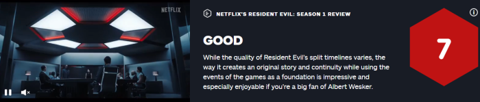 《生化危机》故事分成两条时间线(2022年与2036年),其中一条比另一个更吸引人、更有趣。但《生化危机》第一季提供了一个全新原创故事引人入胜,为第二季留下了充足空间。尽管质量不平衡,但在表演、特效和整体叙事上让人想看更多。如果续订第二季的话,还有很多值得探索的故事线索。
