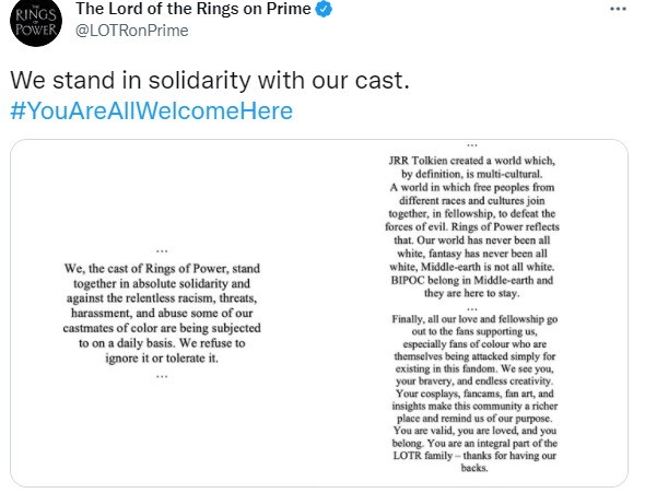 声明说:“我们《指环王:力量之戒》的演员们,团结起来一致反对无情的种族主义。我们一些有色人种演员每天都在遭受威胁、骚扰和欺凌,我们绝不忽视或纵容它。”