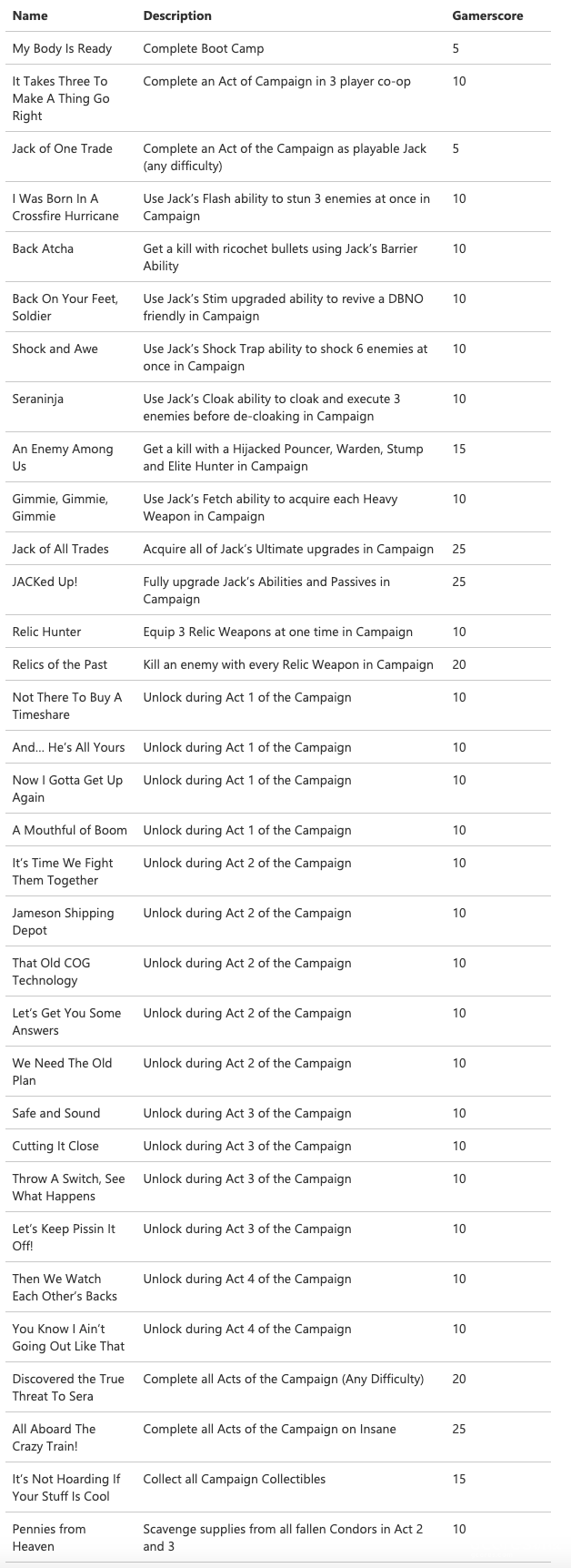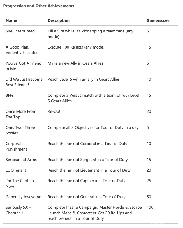最后,官方还一口气公开了《战争机器5》的全成就列表,包括单机模式、逃脱模式、对战模式、持久战以及地图创建等等,共计71个,共计1000点,而且系列传统的变态成就也仍将保留,这次进化到了“Seriously 5.0”,全成就请见下图。