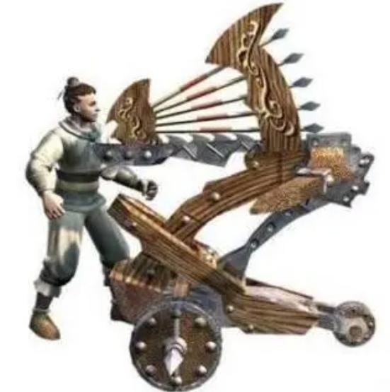 连弩车和转射机都是放置于古代城墙上的守城器械。连弩车需要十人共同操作,使用的特制箭矢长约2.3米,在弩床上能够一次发射数十枚,箭矢尾端还系有绳索,射出后可以用弩车上的辘轳迅速回收,在冷兵器时代堪称神器。