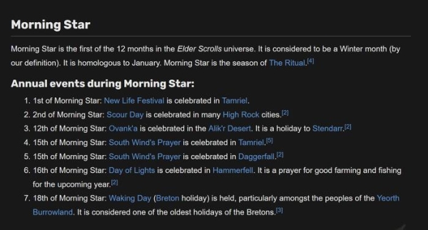 神话起源、世俗化推广、文化传播与本土化……你看,一个简单的节日背后却要有相当充足的设定,才能表现得足够真实。奇幻世界观的游戏在这方面有得天独厚的优势,因为它们总是独创了一整片大陆的全新历史。《上古卷轴5:天际》甚至为游戏的每一个月都安排了一个新的名称,从晨星月、朝阳月到夜星月,每一个月都有独特的代表星座,月月都安排了独特的节日。