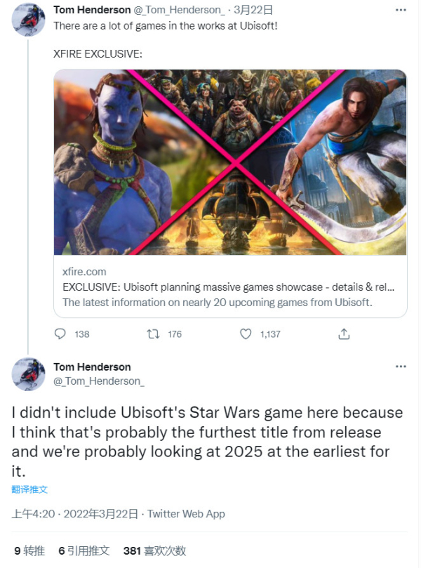 Henderson爆料说:“我没有把育碧的《星战》游戏包括进去,因为我觉得这是距离发售最遥远的游戏,我们最早很有可能在2025年看到它。”