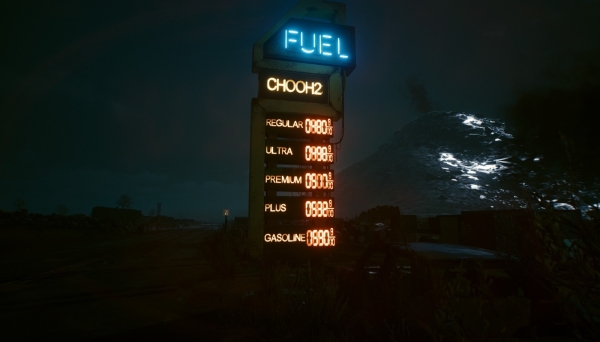 而在《赛博朋克2077》中,燃料价格却比较便宜。在赛博朋克宇宙中,汽油和柴油已被CHOOH2取代,它是一种标准的人工合成酒精燃料,能充分燃烧却有致命缺陷,或会导致失明甚至死亡。一加仑CHOOH2最低价格为4.80美元,最高价格则为5.32美元,毫无疑问这可比现实燃料价格低多了。
