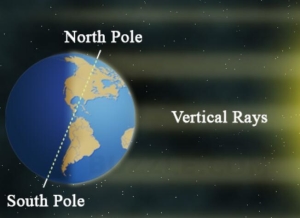 这会带来什么后果呢?我们知道赤道将地球分成了南半球和北半球。如果地球的自转轴是竖直的,那么阳光就会等量地照亮南北半球,而白天和黑夜就会有相等的时间。正因为地球自转轴是倾斜的,南半球和北半球受到的太阳光照射量会不同。你可以尝试用一个手电筒,从不同的水平方向,模拟太阳光照射地球。