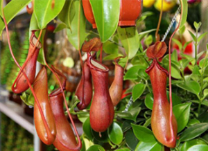 最有名的当然就是猪笼草了。它会长出一个像水壶一样的叶子,里面还装满了液体,发出阵阵的香气。蚂蚁啊苍蝇啊,一些贪吃的昆虫就会跟随着气味来到附近。如果一不小心掉到那个壶的液体里面,就永远也出不来了,会被黏糊糊的液体缠着,最后变成了猪笼草的食物。
