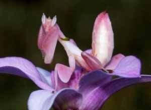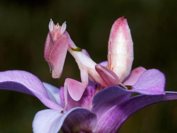 兰花螳螂身体每一节的形态和颜色都在模仿花瓣——白里透红的色泽、隆起的肢体、腹部上类似花蕊的条纹,组合起来像极了一朵盛开的白粉色兰花。不过,它们并非只生活在兰花植株上,开着白色或粉色花朵的灌木丛和矮树丛都在它们的选择范围内。兰花螳螂主要栖息于马来西亚的热带雨林中,它们淡雅的粉红、优美的体态正是模仿了在那里生长着的花朵。通过侦测周围环境不同的湿度、光线等条件,兰花螳螂还会相应改变体色。它们甚至能模仿花朵在风中抖动的样子,以达到更逼真的伪装效果。