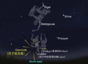 也许你第一次听到“流星雨”这个词时,以为它真的像一场绚丽的“大雨”,就像过年的烟花一样冲进你的视线。那你可能要失望了。你看到的漂亮的流星雨照片都是把不同时段的好多颗流星重叠在一起,合成产生的。但如果仔细观察这些照片,你便能发现这些流星的轨迹源头好像都处于一个点。人们认为那里是流星来临的地方,称为“辐射点”。猜猜双子座流星雨的辐射点在哪里?——正是夜空中的双子座!当流星雨达到极大值时,每小时会有120颗左右的流星划过夜空。