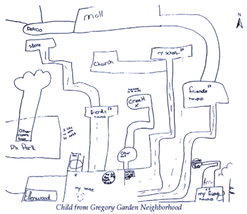 布鲁斯使用的是一种叫做“心理地图”的方法,他招募了社区中9岁和10岁的孩子,让他们画出周围的生活环境,包括学校、朋友的家、玩耍的地点以及汽车等,并标出他们喜欢或讨厌的地方。