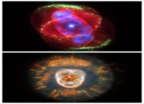 不过,为什么说美丽的行星状星云与恒星的死亡有关呢?恒星,比如我们的太阳,是由非常热的气体组成的,在成长过程中,恒星通过将氢气转化为氦气来产生能量。当氢气被耗尽时,它就开始发生变化。它们会焦躁、膨胀、内部变得不稳定,表面变得松散。接下来,它们会“打喷嚏”,将环绕恒星的外层气体喷出来。当这种情况发生时,恒星会变得更热,还会发出紫外线。随着恒星不停“打喷嚏”,总是有物质被喷出来,剩下的核心温度非常高,发出明亮的光芒。紫外线带动宇宙中的气体、尘埃,一同产生炫彩的光辉,形成星云。所以,基本上,行星状星云是一个巨大的气体球,类似于一个外壳,围绕着一颗垂死的恒星。