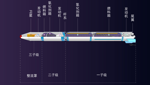 目前航天中的运载火箭多为多级火箭,多级火箭是由数级火箭组合而成的运载工具。每一级都装有发动机与燃料,从尾部最初一级开始,每级火箭燃料用完后自动脱落,同时下一级火箭发动机开始工作,使飞行器继续加速前进。