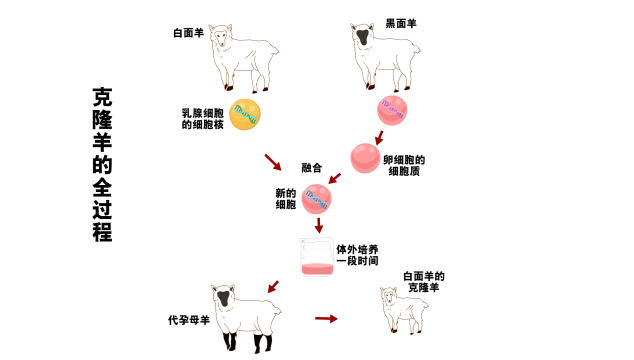 “克隆技术就是英语‘clone’的音译,说白了就是通过人工手段实现生物体的无性繁殖,产生与原个体相同基因的后代的生物技术。”开开按下游戏的暂停键,看向心心,“很多书上都记载着‘多莉’的出生过程。科学家将一只白脸羊的乳腺细胞中包含全套遗传信息的细胞核,与一只黑脸羊提供的无细胞核的卵细胞进行融合,得到了一个含有新的遗传物质但却没有受过精的卵细胞。当卵细胞分裂、分化形成胚胎细胞后,再将胚胎细胞移植到另一只黑脸羊的子宫中,最后出生的小羊就是‘多莉’。也就是说‘多莉’的产生与三只羊有关,一只白脸羊,两只黑脸羊。”