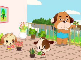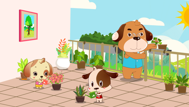 周末的早上,爸爸在阳台忙碌地照料花草,开开和心心在一旁帮忙浇水。此时,爸爸正将一片秋海棠的叶子插入新花盆的土里。