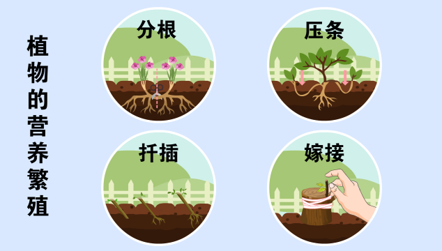 “是的。土豆的块茎埋入土里可发芽生根,长出新的土豆。”爸爸点头道,“分根、压条、扦插、嫁接,就是我们对植物常用的营养繁殖方法。”