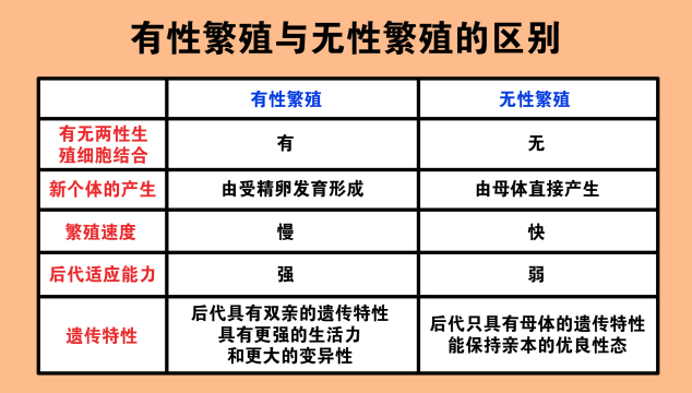 无性繁殖的速度要快于有性繁殖,后代具有亲本的所有优良性状。有性繁殖的后代则具有双亲的遗传特性,存在更大的变异性。但有性繁殖的后代更能适应环境的变化,对生物的进化起到很大的作用。