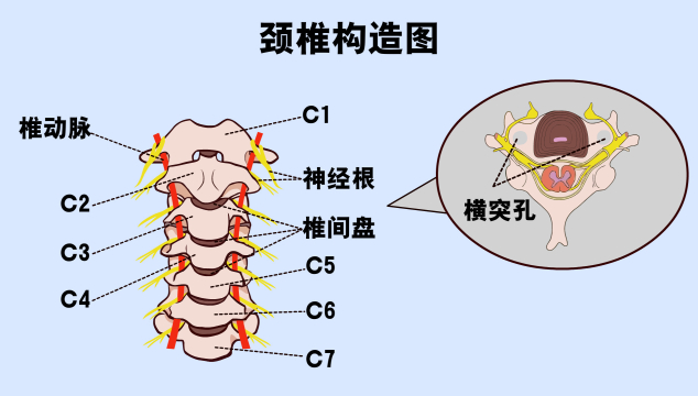 “没错。脊柱的颈部由七个颈椎骨组成,我们用C1至C7,从上至下为它们命名。脊柱颈椎区是非常灵活的,由小关节、椎间盘和韧带组成,颈椎骨横向有横突孔,供应脑部血液的椎动脉就穿行在这些洞洞里。”妈妈介绍道。