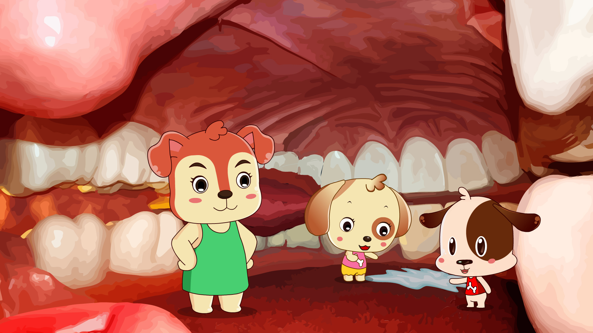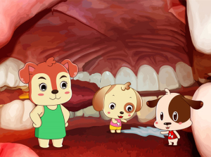 开开心心兴致勃勃地四处观看,一会儿在牙齿上坐一坐,一会儿在舌头上跳,玩的不亦乐乎。突然,开开看到在牙齿附近有一片白色物体,于是问道:“妈妈,那片白色的东西是什么啊?”