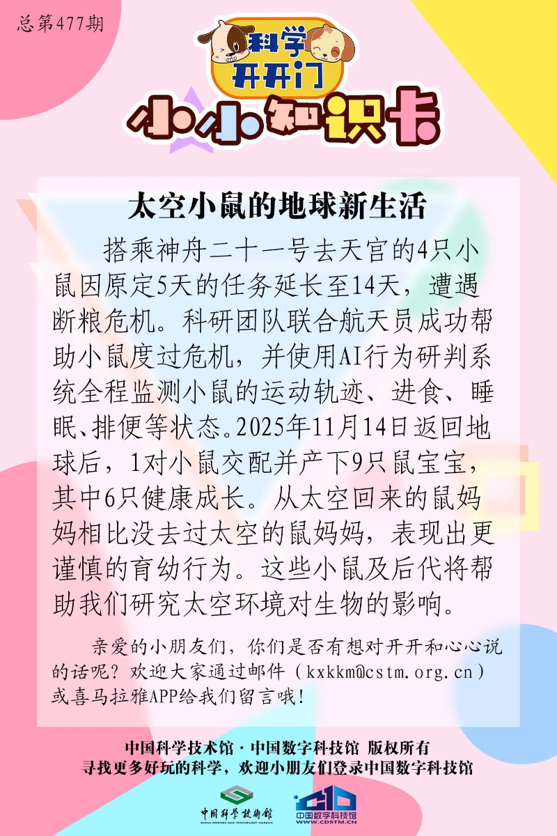 小朋友们,跟随神舟二十一号去太空探险的小鼠们顺利返回地球,还生下了好几只鼠宝宝。它们在太空经历了什么?回到地球后的生活怎么样?快来听本期故事了解一下吧。