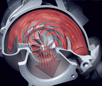 可变涡轮几何特性用来直接改变废气气流中通过转子叶片的截面,为各种情况提供精确和正确的涡轮增压器规格和效果:在低发动机转速时,叶片闭合形成小的气隙。排气流量通过这些小孔加速并在径向以高能级冲击涡轮,如同小涡轮增压器一样。