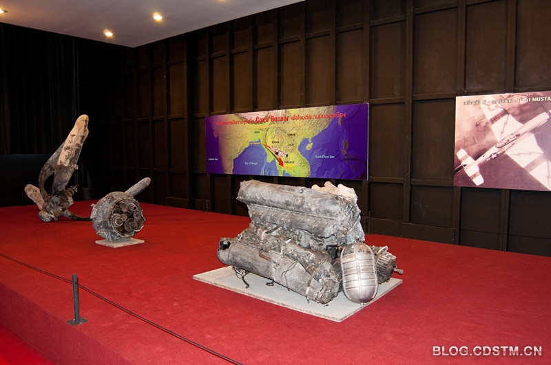 一号展厅陈列着P-51的螺旋桨、变速箱和发动机等残骸,记载着当年的战火岁月。这架P-51的来历有点曲折:1945年初,驻印缅边境的盟军第2航空突击群的第1和第2战斗机中队的P-51D“野马”连续两次,往返1 600英里(2 560千米)跨越孟加拉湾突袭了位于曼谷廊曼机场的日本机群,毁伤了约100架日本飞机。参加首轮突袭的24架“野马”全身而退,但在4月9日的第二轮突袭中第2中队的3架“野马”被击落,其中一架到战争结束都没找到。直到2010年,在泰国西部农田池塘里发现了一架飞机残骸。部分残骸从厚厚的污泥中被挖掘出来后,航空史专家根据发动机、螺旋桨及一小块机身蒙皮上的黑色闪电图案考证出这就是1945年初攻击廊曼机场后失踪的那架P-51D“野马”,但该机究竟是毁于空战还是地面炮火还有待考证。后来博物馆方面还找到了当年“野马”驾驶员的家属来此地凭悼,不过家属提出了索取一小片“野马”残骸的要求被博物馆方面婉拒了。