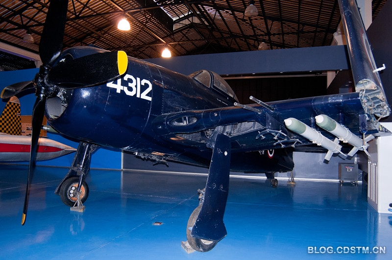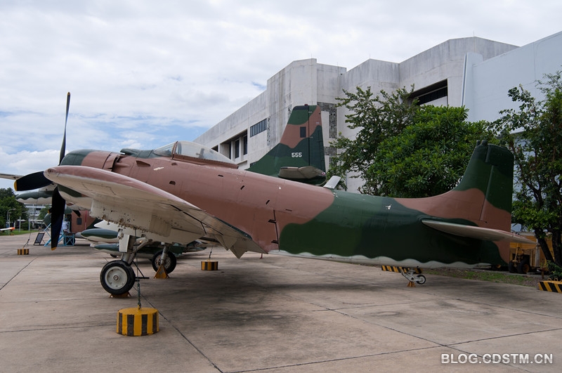 这架高大坚固的A-1J的来历又有点复杂,全身没有任何标记,据考证是在越战中美国空军被击落的一架A-1J。当时这架飞机执行任务时,右翼起落架舱附近被23毫米高炮击中引发火灾,驾驶员当即跳伞逃生。但火灾奇迹般地熄灭了,飞机继续平稳地飞入泰国境内并以腹部迫降。从打开的起落架舱门清晰可见火烧痕迹,而且机腹中部的两个襟翼动作筒整流罩的底部被磨平,外侧整流罩就没有这个情况,可见当时飞机“自动迫降“之平稳。