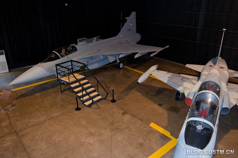 图18 一号展厅右厅的瑞典JAS.39“鹰狮”(左)和美制F-5B双座型(右)