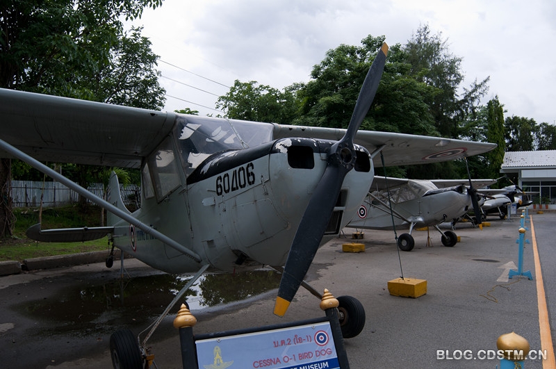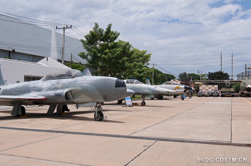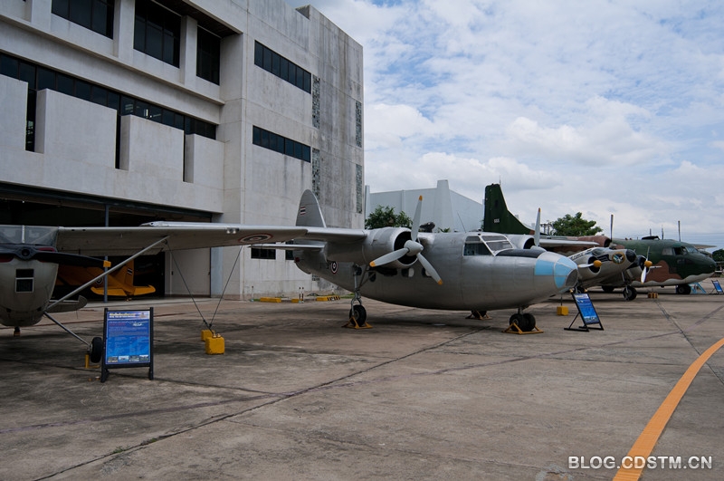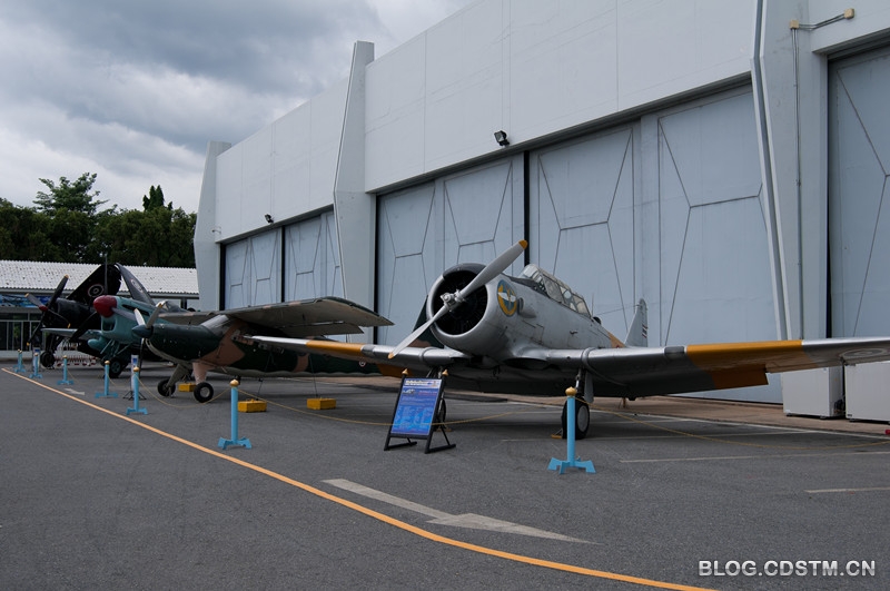室外展品则更加丰富,一进大门的右侧,就可以看到德•哈维兰DCH-1“金花鼠”教练机、马基SF-260MT教练机、RT-33A侦察/教练机、T-6“得州人”教练机和T-37B教练机。大门左侧是另一架T-6“得州人”、U-10“信使”多用途飞机、“萤火虫”(这架萤火虫的右翼在我们参观前几天,因为博物馆工作人员不了解其主翼折叠方式而被人为损坏。萤火虫的主翼应扭转后折向后方,泰国人硬生生把主翼向上掰)、SB2C“地狱俯冲者”俯冲轰炸机(因为原装主轮早就报废且找不到配件,博物馆用两个卡车轮胎代替)。不远处还依次排列着格鲁曼G-44A联络机、另一架德•哈维兰DCH-1“金花鼠”、派帕L-4“草蜢”、塞斯纳O-1“探子”、比奇 BONANZA 35等几种通用机或联络机。一号展厅和三、四、五号展厅之间的展坪上的展品更多:帕兹马尼PL-2、塞斯纳O-1“探子”、帕西瓦尔“太子”3运输机、比奇C-45“促进者”运输机、C-123“供应者”运输机、A-37B“蜻蜓”攻击机、A-1J“天袭者”(仅存一架)、T-28“特洛伊人”攻击教练机、OV-10“野马”观测机、另一架RT-33A侦察教练机、RF-5A侦察机、F-86L战斗机、F-84G战斗攻击机。还有泰国自行研制的RTAF-5观察教练机(仅存一架)、RTAF-2教练机(仅存一架)和RTAF-4教练机。
