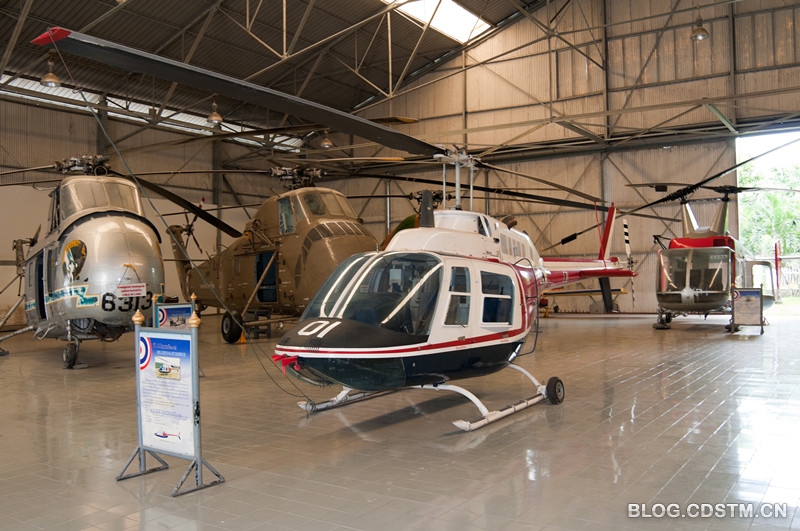 博物馆最后方的五号展厅目前主要存放直升机,这里可以看到韦斯特兰WS-51,西科斯基YR-5A、H-19、H-34、S-58,卡曼H-43,以及贝尔212、OH-13H和希勒360,还有一架在2011泰国洪灾中受损报废的贝尔206(该机下半机身在水泡了几个月,座舱下部全部发霉)。一架购自德国外形古怪的FT-400涵道风扇教练机和一架“喷火”XIV也存放在此。“喷火”的螺旋桨已经明显腐蚀损坏,但没有得到妥善维修。
