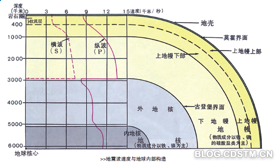 根据同样的原理,1914年,另外一位著名的地震学家古登堡发现,从莫霍面往下,地震波速一直慢慢增大,但到了2900 千米深处,纵波速度骤然下降,横波突然中止消失,不再向下传播。很显然,这里又出现了一个分界面。后人为了纪念古登堡的这一伟大发现,将这个界面称为“古登堡面”。它是地核与地幔的分界层,上部是地幔,下部就是地核。随着研究的不断深入,人们逐渐认识到,地球的内核分为两部分,即外核与内核。其中,从地下2900~5000千米深处,叫做外核,接近于液体,为铁、硅、镍组成的熔融体;5000 千米以下的深部为内核,呈现出固态特征。