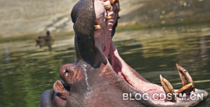 白天,河马几乎全在水中,能潜水半小时不露出头换气。因此,你根本看不见它,也不知道什么时候、在哪儿,它会突然冒出来,张开那可怕的大嘴。河马平时较安静,一旦发起怒来,会顶翻小船甚至将船咬成两段。所以,划船的人对河马也十分畏惧。