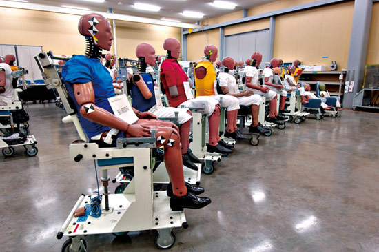 其二是东富士研究所内的假人实验室。在前面提到的新威驰碰撞实验中,其所采用的假人只是整个试验众多假人中的一种。在假人实验中,记者看到既有价值500万~600万日元(大约35万~42万人民币)的HⅢ模型,也有丰田与欧美研究机构共同开发的价值1亿日元(大约700万人民币)的SID模型。从种类上看,既有全球不同地区不同身材的成年男性和女性,也有10岁、6岁儿童和婴儿,包括孕妇在内的特殊人群也都有相应的模型。据东富士研究所的工作人员介绍,这些假人使用10次之后都要进行体检,假人的身体部件会被拆解成很多部分,分别进行检测和标定,对于误差超过限定值的模型器官就要进行修理或者更换,只有通过这样的标定才能确保每次碰撞实验能够公平公正,从而为后续的安全改善工作提供真实可信的实验数据。