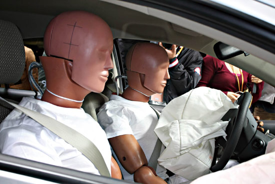碰撞后VIOS威驰驾驶舱内可见假人姿态未变,两个气囊完全打开后已收缩